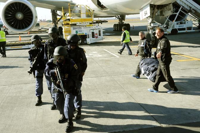 IPTC: Caption L'aereo Boeing 777 dell' Alitalia con a bordo la nazionale di calcio di Lippi, appena giunta a Johannesburg. Ad accoglierle gli azzurri un eccezionale dispositivo di sicurezza con una squadra di teste di cuoio.Volo tranquillo e dormita per tutti gli azzurri, che appena scesi dalla scaletta sono stati accompagnati in un compound per gli accrediti Fifa e subito dopo si trasferiranno al ritiro di Centurion. Nel pomeriggio, primo allenamento. DBA / CIRO FUSCO
