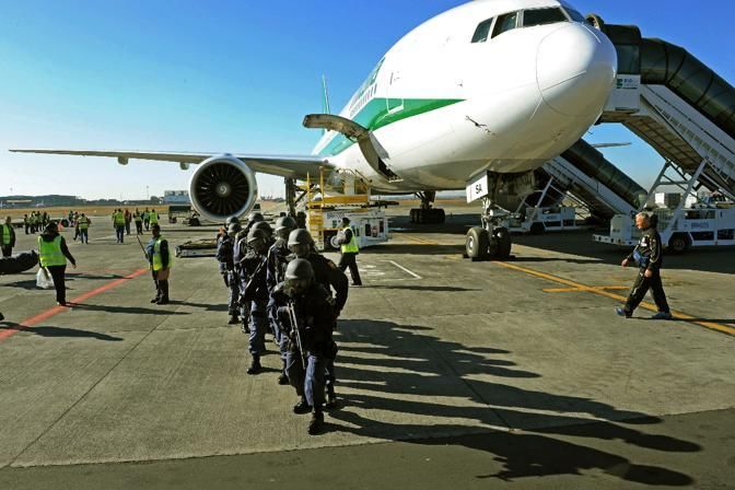 IPTC: Caption L'aereo Boeing 777 dell' Alitalia con a bordo la nazionale di calcio di Lippi, appena giunta a Johannesburg. Ad accoglierle gli azzurri un eccezionale dispositivo di sicurezza con una squadra di teste di cuoio.Volo tranquillo e dormita per tutti gli azzurri, che appena scesi dalla scaletta sono stati accompagnati in un compound per gli accrediti Fifa e subito dopo si trasferiranno al ritiro di Centurion. Nel pomeriggio, primo allenamento. DBA / CIRO FUSCO
