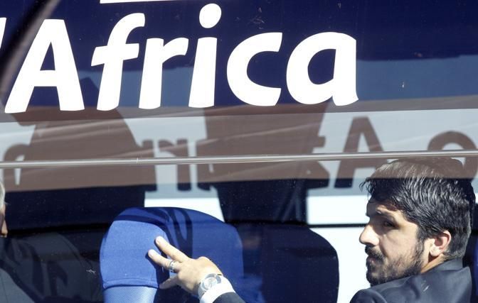 Italy's soccer player Gennaro Gattuso sit in team's bus after their arrival at Johannesburg's O.R. Tambo airport June 9, 2010. The 2010 Soccer World Cup kicks off on June 11. REUTERS/Alessandro Bianchi (SOUTH AFRICA - Tags: SPORT SOCCER WORLD CUP)