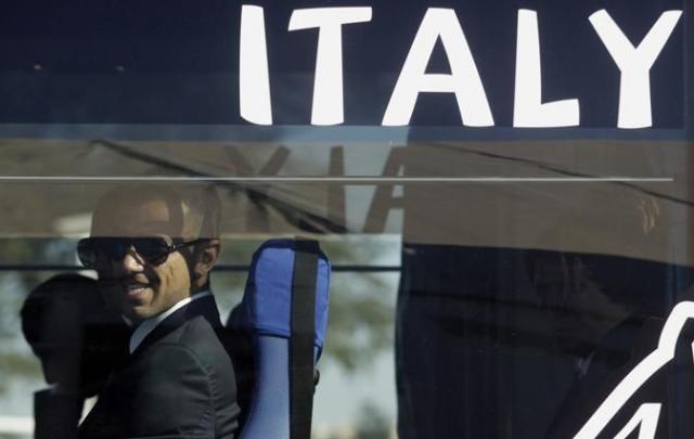 Italy forward Fabio Quagliarella smiles as he sits in a bus upon the team's arrival at the OR Tambo International Airport in Johannesburg, Wednesday May June 9, 2010. Italy will play in group F at the soccer World Cup, which gets underway on June 11, 2010. (AP Photo/Themba Hadebe)