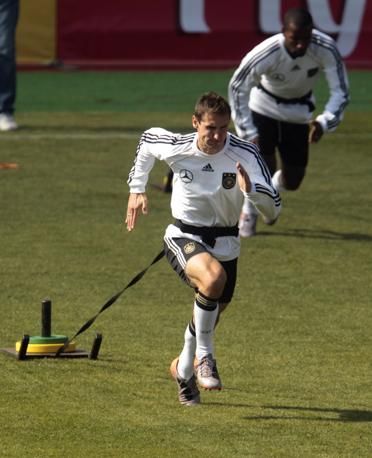 Germany's Miroslav Klose and Cacau (R) warm up during a training session in Pretoria June 10, 2010. The 2010 Soccer World Cup kicks off on June 11. REUTERS/Ina Fassbender (SOUTH AFRICA - Tags: SPORT SOCCER WORLD CUP)