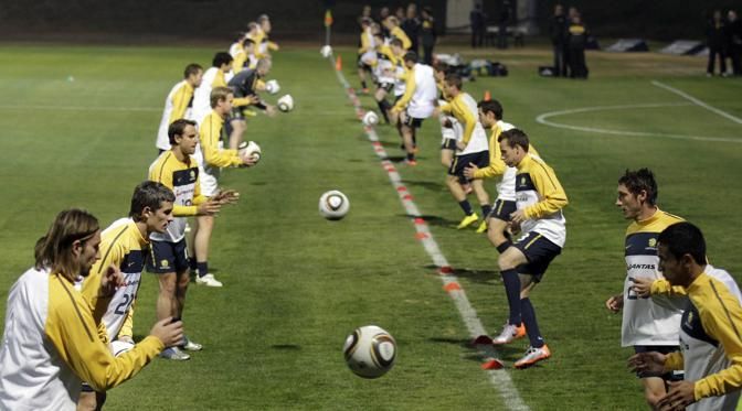 IPTC: Caption The Australian team including, Tim Cahill bottom right, and Josh Kennedy bottom left, pracise ball skills during team training at St Stithians College in Johannesburg, South Africa, Thursday, June 10, 2010. Australia will play in group D in the upcoming World Cup, that starts on June 11.(AP Photo/Rob Griffith)
