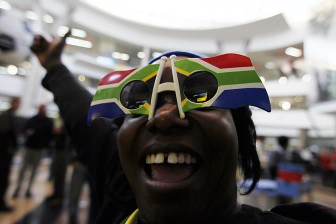 A South Afirican fan welcomes visitors Thursday, June 10, 2010 at the OR Tambo International Airport in Johannesburg, South Africa. The Soccer World Cup is set to kick-off Friday, June 11. (AP Photo/Eugene Hoshiko)