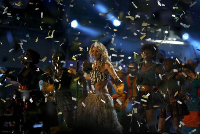 Singer Shakira performs during the opening concert for the 2010 World Cup at the Orlando Stadium in Soweto, Johannesburg June 10, 2010. REUTERS/Thomas Mukoya (SOUTH AFRICA - Tags: SPORT SOCCER WORLD CUP ENTERTAINMENT)