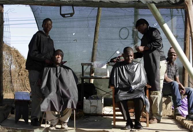 Sidewalk barbers ply their trade in Kliptown, Soweto, South Africa, Wednesday June 9,2010. Once an anti-apartheid battleground, the vast township of Soweto, from it's shacks to its growing stock of luxury homes, is now brimming with exhilaration as the World Cup opens on the edge of the sprawling township. For Sowetans, who number well over 1 million, it's a time not only to follow soccer, but also celebrate progress and reflect on unmet promises. (AP Photo/Denis Farrell)