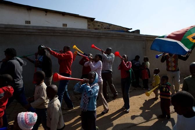 A group of youths play the vuvuzela in Soweto, near Johannesburg, on June 10, 2010 a day before the start of the 2010 World Cup football tournament in South Africa. AFP PHOTO / Yasuyoshi Chiba