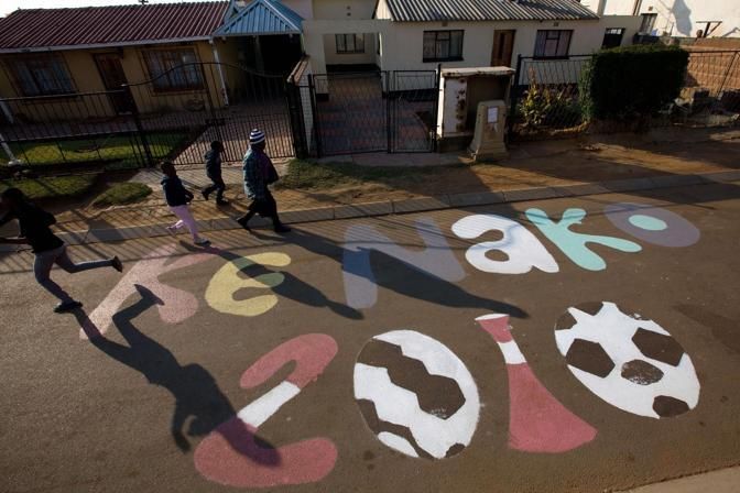 Residents of Soweto, a suburb of Johannesburg, paint the streets as they welcome to the World Cup on June 10, 2010 a day before the start of the 2010 World Cup football tournament in South Africa. AFP PHOTO/Yasuyoshi Chiba