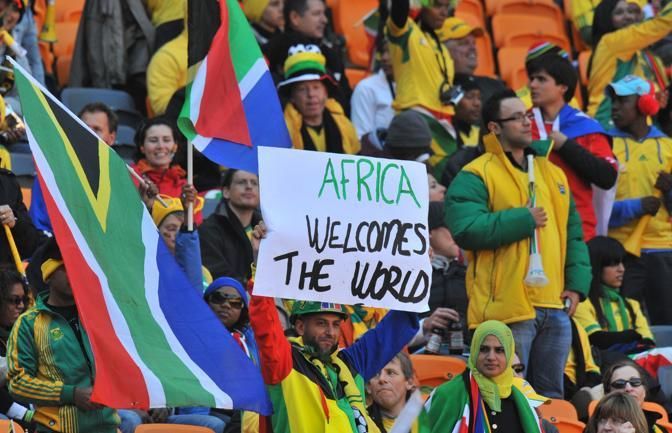 A football fan holds up a placard reading 'Africa welcomes the world' at the start of the opening ceremony of the 2010 FIFA World Cup on June 11, 2010 at Soccer City stadium in Soweto, suburban Johannesburg. South Africa and Mexico play in the opening match of the 2010 FIFA World Cup. NO PUSH TO MOBILE / MOBILE USE SOLELY WITHIN EDITORIAL ARTICLE - AFP PHOTO / ALEXANDER JOE