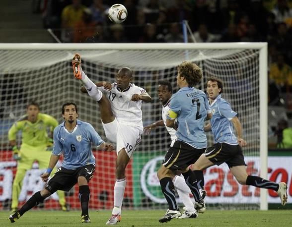 France's Abou Diaby, second from left, clears the ball past Uruguay's Mauricio Victorino, left, and Uruguay's Diego Lugano, second from right, during the World Cup group A soccer match between Uruguay and France in Cape Town, South Africa, on Friday, June 11, 2010. (AP Photo/Julie Jacobson)