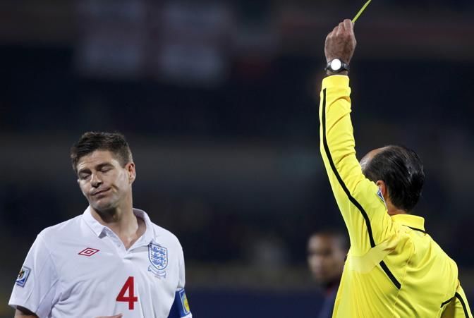 IPTC: Caption England's Steven Gerrard receives a yellow card by referee Carlos Simon of Brazil in their 2010 World Cup Group C soccer match against the US at Royal Bafokeng stadium in Rustenburg June 12, 2010. REUTERS/Marcos Brindicci (SOUTH AFRICA - Tags: SPORT SOCCER WORLD CUP)