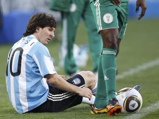 Argentina's Lionel Messi reacts during the 2010 World Cup Group B soccer match against Nigeria at Ellis Park stadium in Johannesburg June 12, 2010. REUTERS/Jerry Lampen (SOUTH AFRICA - Tags: SPORT SOCCER WORLD CUP)