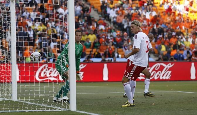 IPTC: Caption Denmark's goalkeeper Thomas Soerensen (L) fails to catch a shot by Denmark's defender Simon Poulsen (back, R) who scored an own goal during the Group E first round 2010 World Cup football match Netherlands vs. Denmark on June 14, 2010 at Soccer City stadium in Soweto, suburban Johannesburg. NO PUSH TO MOBILE / MOBILE USE SOLELY WITHIN EDITORIAL ARTICLE - AFP PHOTO / THOMAS COEX