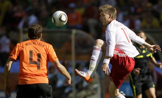 Denmark's Nicklas Bendtner, right, competes for the ball with Netherlands' Joris Mathijsen, left, during the World Cup group E soccer match between the Netherlands and Denmark at Soccer City in Johannesburg, South Africa, Monday, June 14, 2010. (AP Photo/Ivan Sekretarev)