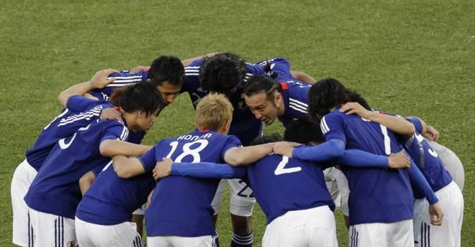 The Japan team huddle during the World Cup group E soccer match between Japan and Cameroon at Free State Stadium in Bloemfontein, South Africa, Monday, June 14, 2010. (AP Photo/Michael Sohn)