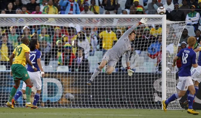 epa02201903 Japan's goalkeeper Eiji Kawashima (C) stretches for a save during the FIFA World Cup 2010 group E preliminary round match between Japan and Cameroon at the Free State stadium in Bloemfontein, South Africa, 14 June 2010. EPA/YURI KOCHETKOV Please refer to www.epa.eu/downloads/FIFA-WorldCup2010-Terms-and-Conditions.pdf