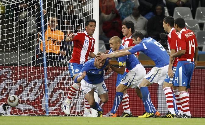 IPTC: Caption Italy's Daniele De Rossi (6) celebrates with team mates after scoring a goal during their 2010 World Cup Group F soccer match against Paraguay at Green Point stadium in Cape Town June 14, 2010. REUTERS/Stefano Rellandini (SOUTH AFRICA - Tags: SPORT SOCCER WORLD CUP)