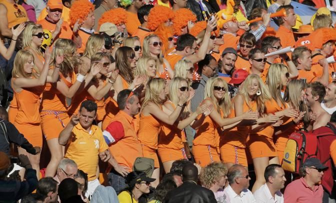 Netherlands' fans celebrate after their win over Denmark in their 2010 World Cup Group E soccer match at Soccer City stadium in Johannesburg June 14, 2010. REUTERS/Michael Kooren (SOUTH AFRICA - Tags: SPORT SOCCER WORLD CUP)