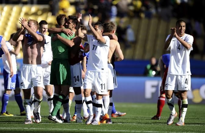 New Zealand's players celebrate after their 2010 World Cup Group F soccer match against Slovakia at Royal Bafokeng stadium in Rustenburg June 15, 2010. REUTERS/Dylan Martinez (SOUTH AFRICA - Tags: SPORT SOCCER WORLD CUP)