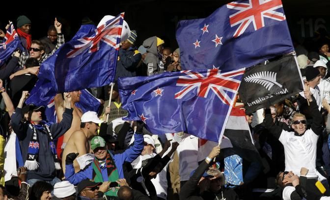 Supporters celebrate after New Zealand's Winston Reid scored the equalizing goal during the World Cup group F soccer match between New Zealand and Slovakia at Royal Bafokeng Stadium in Rustenburg, South Africa, on Tuesday, June 15, 2010. (AP Photo/Lee Jin-man)