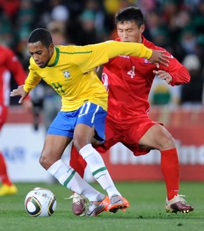 epa02203877 Brazil's Robinho (L) vies with North Korean player Pak Nam Chol (R) during the FIFA World Cup 2010 group G preliminary round match between Brazil and North Korea at the Ellis Park stadium in Johannesburg, South Africa, 15 June 2010. EPA/GEORGI LICOVSKI Please refer to www.epa.eu/downloads/FIFA-WorldCup2010-Terms-and-Conditions.pdf