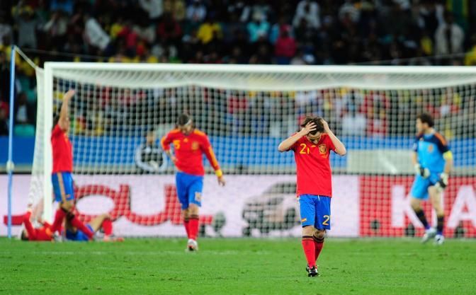 DURBAN, SOUTH AFRICA - JUNE 16: David Silva of Spain looks dejected after Gelson Fernandes of Switzerland scored the first goal during the 2010 FIFA World Cup South Africa Group H match between Spain and Switzerland at Durban Stadium on June 16, 2010 in Durban, South Africa. (Photo by Jamie McDonald/Getty Images) *** Local Caption *** David Silva - Spain v Switzerland: Group H - 2010 FIFA World Cup - fotografo: GettyImages