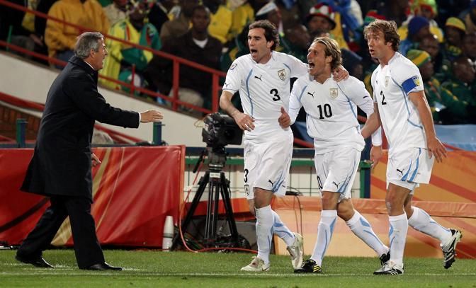Diego Forlan (C) celebrates with Diego Lugano (R) and Diego Godin after scoring the first goal for Uruguay