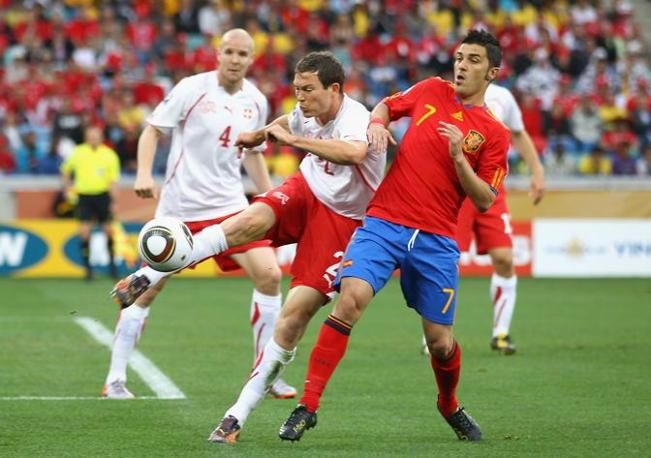 DURBAN, SOUTH AFRICA - JUNE 16: Stephan Lichtsteiner of Switzerland and David Villa of Spain in action during the 2010 FIFA World Cup South Africa Group H match between Spain and Switzerland at Durban Stadium on June 16, 2010 in Durban, South Africa. (Photo by Lars Baron/Getty Images) *** Local Caption *** Stephan Lichtsteiner;David Villa - Spain v Switzerland: Group H - 2010 FIFA World Cup - fotografo: GettyImages
