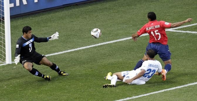 Chile's Jean Beausejour, right, shoots to score past Honduras goalkeeper Noel Valladares during the World Cup group H soccer match between Honduras and Chile at Mbombela Stadium in Nelspruit, South Africa, Wednesday, June 16, 2010. (AP Photo/Michael Sohn)