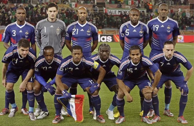 IPTC: Caption epa02207778 French national soccer team players (top row, L-R) Eric Abidal, goalkeeper Hugo Lloris, Nicolas Anelka, William Gallas and Abou Diaby; (front row, L-R) Jeremy Toulalan, Sidney Gouvou, team captain Patrice Evra, Bakari Sagna, Florent Malouda and Franck Ribery pose for photographers before the FIFA World Cup 2010 group A preliminary round match between France and Mexico at the Peter Mokaba stadium in Polokwane, South Africa, 17 June 2010. EPA/JONATHAN BRADY Please refer to www.epa.eu/downloads/FIFA-WorldCup2010-Terms-and-Conditions.pdf IPTC: Copyright Notice ANSA