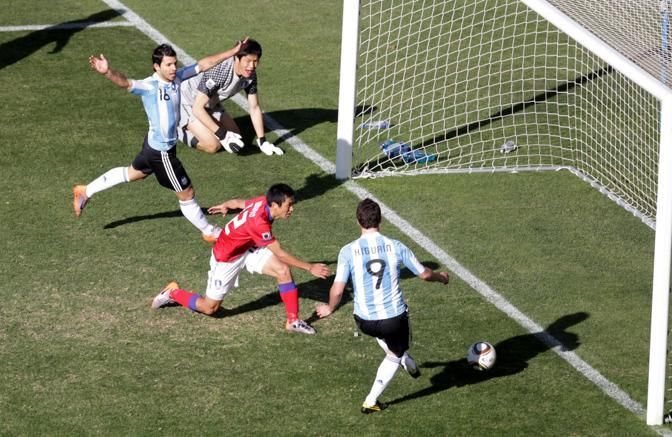 IPTC: Caption epa02207008 Argentina's Gonzalo Higuain (R) scores for his side during the FIFA World Cup 2010 group B preliminary round match between Argentina and South Korea at the Soccer City stadium outside Johannesburg, South Africa, 17 June 2010. EPA/JON HRUSA IPTC: Copyright Notice ANSA