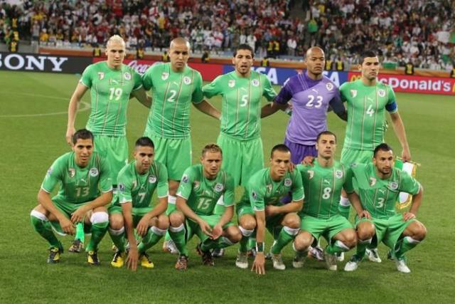 epa02210083 Algerian national soccer team players (top row, L-R) Hassan Yebda, Madjid Bougherra, Rafik Halliche, goalkeeper Rais M'Bolhi and team captain Anther Yahia; (front row, L-R) Karim Matmour, Ryad Boudebouz, Karim Ziani, Foued Kadir, Medhi Lacen and Nadir Belhadj pose for photographers before the FIFA World Cup 2010 group C preliminary round match between England and Algeria at the Green Point stadium in Cape Town, South Africa, 18 June 2010. EPA/MOHAMED MESSARA Please refer to www.epa.eu/downloads/FIFA-WorldCup2010-Terms-and-Conditions.pdf