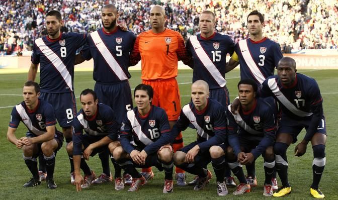 United States players, front row from left, Steve Cherundolo, Landon Donovan, Jose Torres, Michael Bradley, Robbie Findley, Jozy Altidore, back row from left, Clint Dempsey, Oguchi Onyewu, goalkeeper Tim Howard, Jay DeMerit, and Carlos Bocanegra, pose for a team photo before the World Cup group C soccer match between Slovenia and the United States at Ellis Park Stadium in Johannesburg, South Africa, Friday, June 18, 2010. (AP Photo/Luca Bruno)