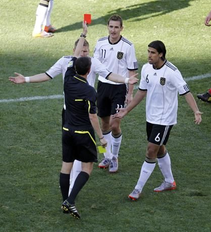 Referee Alberto Undiano of Spain shows the red card to Germany's Miroslav Klose (C) during a 2010 World Cup Group D soccer match against Serbia at Nelson Mandela Bay stadium in Port Elizabeth June 18, 2010. REUTERS/Paul Hanna (SOUTH AFRICA - Tags: SPORT SOCCER WORLD CUP)