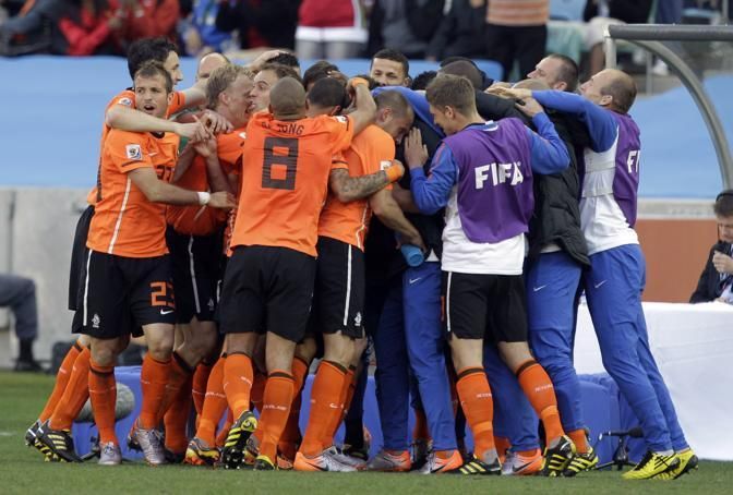 Dutch players celebrate Wesley Sneijder's goal during the World Cup group E soccer match between the Netherlands and Japan at the stadium in Durban, South Africa, Saturday, June 19, 2010. (AP Photo/Schalk van Zuydam)