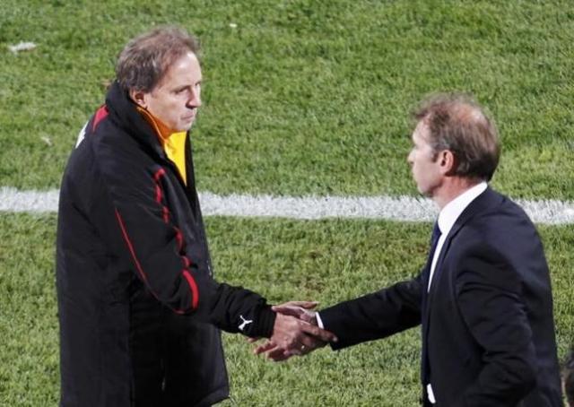 Australia's coach Pim Verbeek shakes hands with Ghana's coach Milovan Rajevac (L) after the final whistle in their 2010 World Cup Group D soccer match at Royal Bafokeng stadium in Rustenburg June 19, 2010. REUTERS/Kim Kyung-Hoon (SOUTH AFRICA - Tags: SPORT SOCCER WORLD CUP)