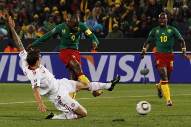 Cameroon's Samuel Eto'o, center, kicks to score a goal as Denmark's Daniel Agger, left, fails to stop the ball, during the World Cup group E soccer match between Cameroon and Denmark at the Loftus Versfeld Stadium in Pretoria, South Africa, Saturday, June 19, 2010. (AP Photo/Bernat Armangue)