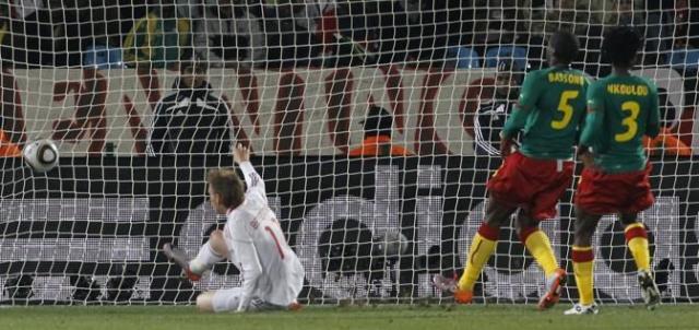 Denmark's Nicklas Bendtner, left, scores a goal during the World Cup group E soccer match between Cameroon and Denmark at the Loftus Versfeld Stadium in Pretoria, South Africa, Saturday, June 19, 2010. (AP Photo/Bernat Armangue)
