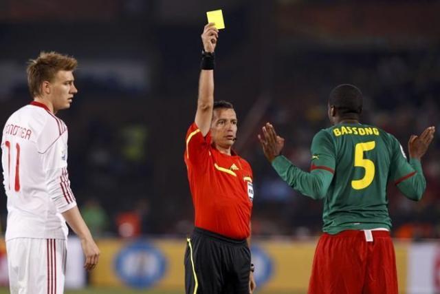 Referee Jorge Larrionda of Uruguay shows the yellow card to Cameroon's Sebastien Bassong (R) after he fouled Denmark's Nicklas Bendtner (L) during a 2010 World Cup Group E soccer match against Denmark at Loftus Versfeld stadium in Pretoria June 19, 2010. REUTERS/Alessandro Bianchi (SOUTH AFRICA - Tags: SPORT SOCCER WORLD CUP)