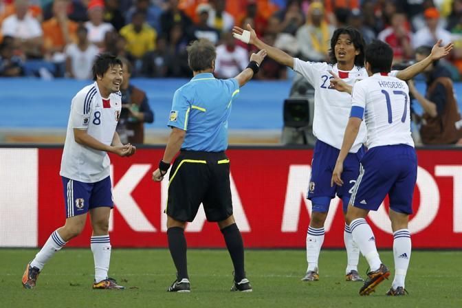 Japan's Yuji Nakazawa argues with the referee with teammates Daisuke Matsui (L) and Makoto Hasebe (R) during their 2010 World Cup Group E soccer match against the Netherlands at Moses Mabhida stadium in Durban June 19, 2010. REUTERS/Toru Hanai (SOUTH AFRICA - Tags: SPORT SOCCER WORLD CUP)