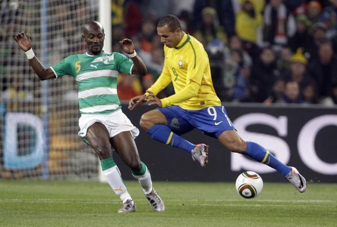 Brazil's Luis Fabiano, right, and Ivory Coast's Didier Zokora go for the ball during the World Cup group G soccer match between Brazil and Ivory Coast at Soccer City in Johannesburg, South Africa, Sunday, June 20, 2010. (AP Photo/Frank Augstein)
