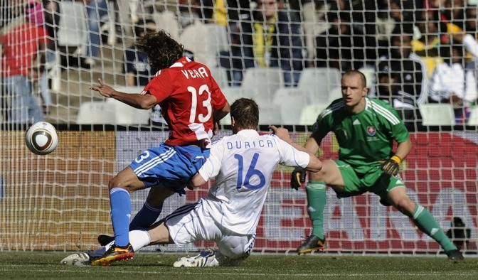 Paraguay's Enrique Vera, left, goes to score against Slovakia goalkeeper Jan Mucha, right, and Slovakia's Jan Durica during the World Cup group F soccer match between Slovakia and Paraguay at Free State Stadium in Bloemfontein, South Africa, Sunday, June 20, 2010. (AP Photo/Martin Meissner)