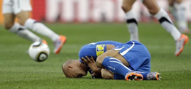 Italy's Fabio Cannavaro lies on the pitch during the World Cup group F soccer match between Italy and New Zealand at Mbombela Stadium in Nelspruit, South Africa, Sunday, June 20, 2010. (AP Photo/Alessandra Tarantino)