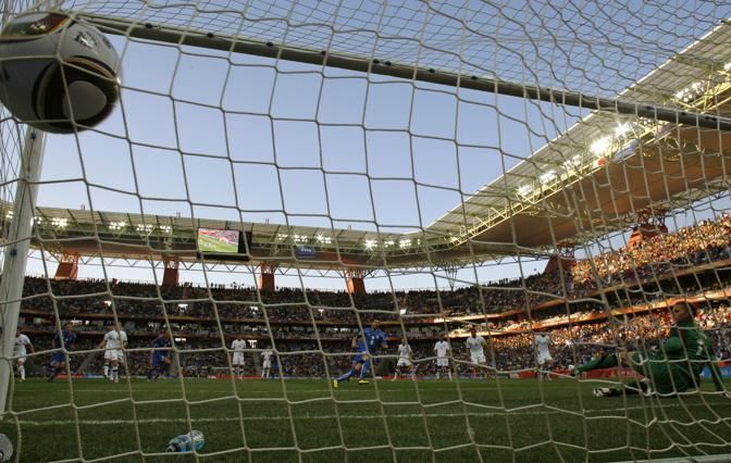 IPTC: Caption Italy's Vincenzo Iaquinta, center, scores on a penalty kick past New Zealand goalkeeper Mark Paston, right, during the World Cup group F soccer match between Italy and New Zealand at Mbombela Stadium in Nelspruit, South Africa, Sunday, June 20, 2010. (AP Photo/Eugene Hoshiko)