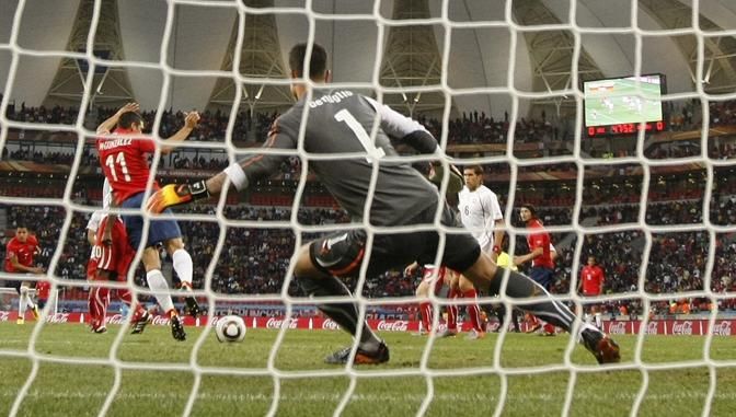 Chile's Alexis Sanchez (L) scores a goal that disallowed for offisde during the 2010 World Cup Group H match against Switzerland at Nelson Mandela Bay stadium in Port Elizabeth June 21, 2010. REUTERS/Michael Buholzer (SOUTH AFRICA - Tags: SPORT SOCCER WORLD CUP)