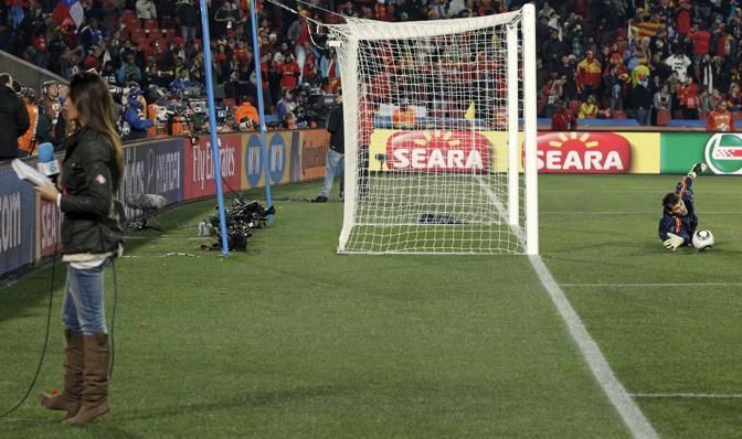 IPTC: Caption Spain goalkeeper Iker Casillas, right, practices as his girlfriend, Spanish sports television presenter Sara Carbonero works before the start of the World Cup group H soccer match between Spain and Honduras at Ellis Park Stadium in Johannesburg, South Africa, Monday, June 21, 2010. (AP Photo/Matt Dunham)
