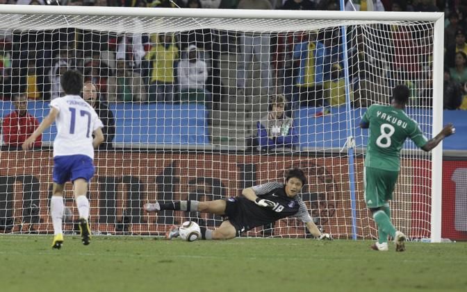 Nigeria's Yakubu Ayegbeni, right, takes a penalty-kick to score against South Korea goalkeeper Jung Sung-ryong, center, during the World Cup group B soccer match between Nigeria and South Korea at the stadium in Durban, South Africa, Tuesday, June 22, 2010. (AP Photo/Lee Jin-man)