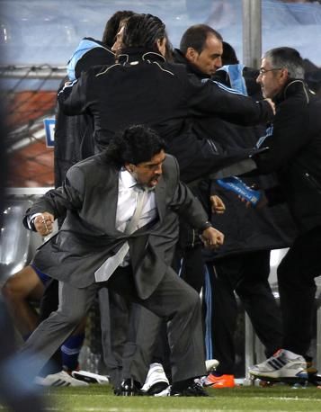 Argentina's coach Diego Maradona celebrates after his team scored the second goal against Greece during a 2010 World Cup Group B soccer match against Greece at Peter Mokaba stadium in Polokwane June 22, 2010. REUTERS/Amr Abdallah Dalsh (SOUTH AFRICA - Tags: SPORT SOCCER WORLD CUP)