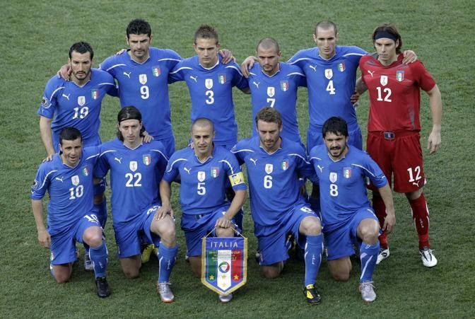 Italy players pose for a team photo prior to the World Cup group F soccer match between Slovakia and Italy at Ellis Park Stadium in Johannesburg, South Africa, Thursday, June 24, 2010. Back row from left, Gianluca Zambrotta, Vincenzo Iaquinta, Domenico Criscito, Simone Pepe, Giorgio Chiellini, and goalkeeper Federico Marchetti. Front row from left: Antonio Di Natale, Riccardo Montolivo, Fabio Cannavaro, Daniele De Rossi, and Rino Gattuso. (AP Photo/Michael Sohn)