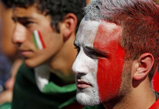 Delusione per il momentaneo svantaggio degli azzurri (0-1) sul volto dei tifosi dell'Italia nel villaggio Fifa a piazza di Siena, Roma, dove Italia-Slovacchia va in onda su un maxi schermo. ALESSANDRO DI MEO/CRI