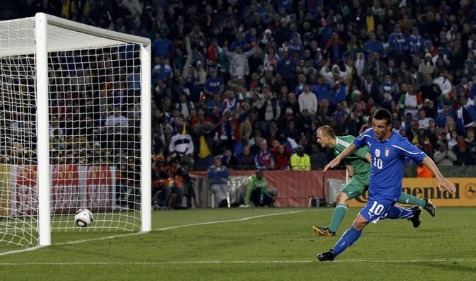 Italy's Antonio Di Natale (10) scores a goal past Slovakia's goalkeeper Jan Mucha during their 2010 World Cup Group F soccer match at Ellis Park stadium in Johannesburg June 24, 2010. REUTERS/Christian Charisius (SOUTH AFRICA - Tags: SPORT SOCCER WORLD CUP)